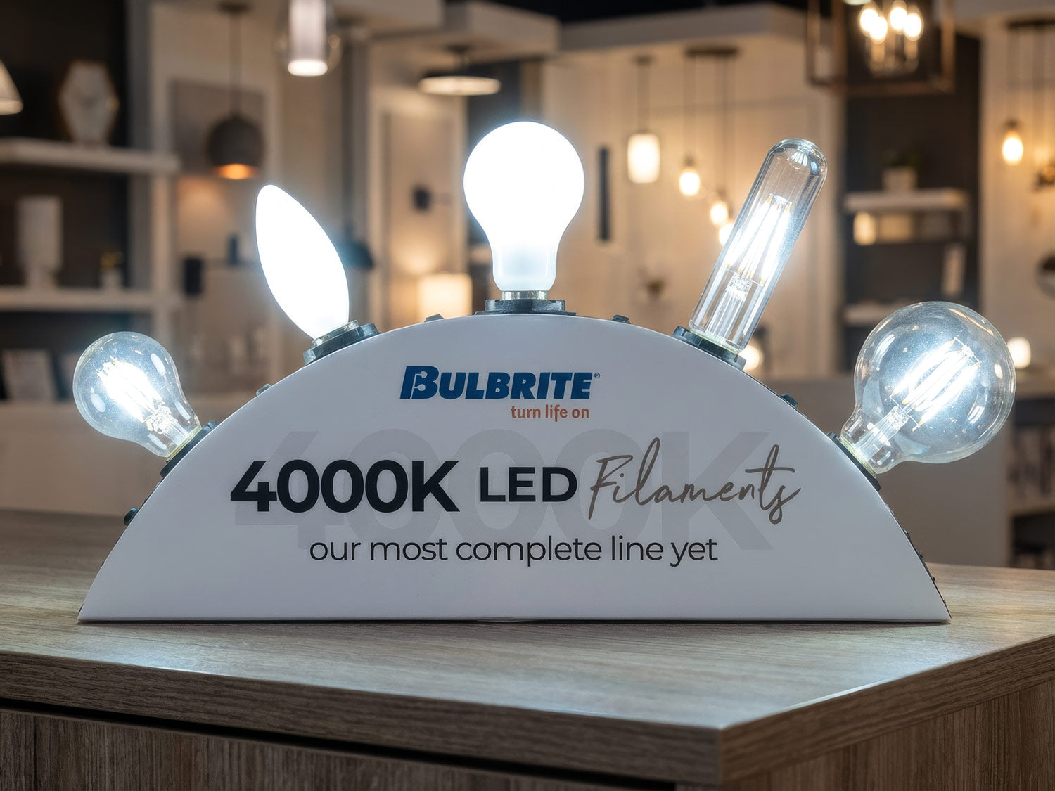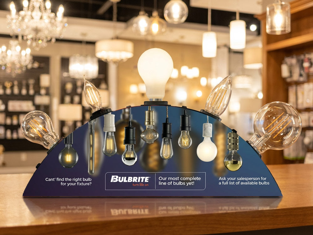 The Decorative Half Moon Display showcases Bulbrite’s key filament bulbs, shapes, and finishes, making it easy for customers to find the perfect match for their fixture.