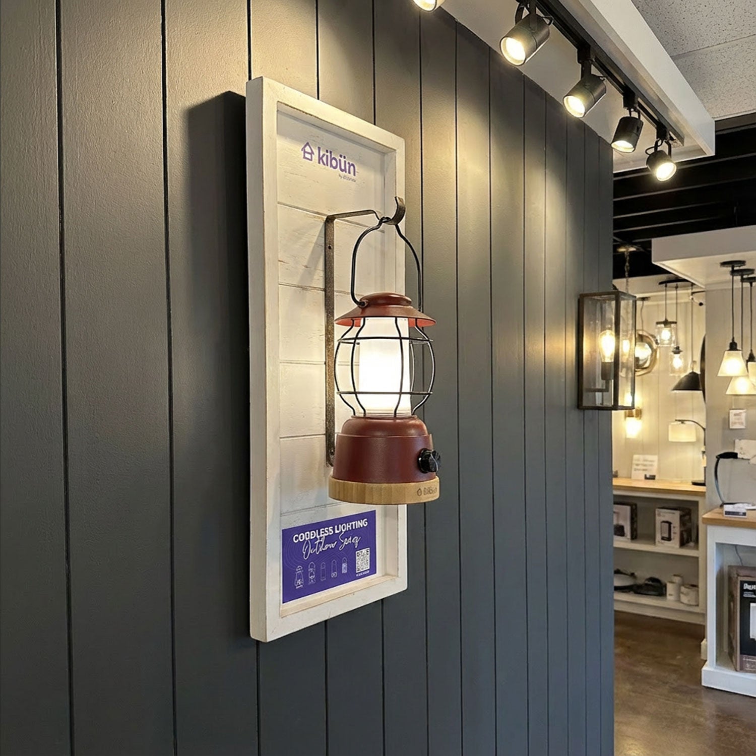 This display showcases the Outdoor Series Cordless Lantern 6”x3” with branded signage and QR code for easy viewing.