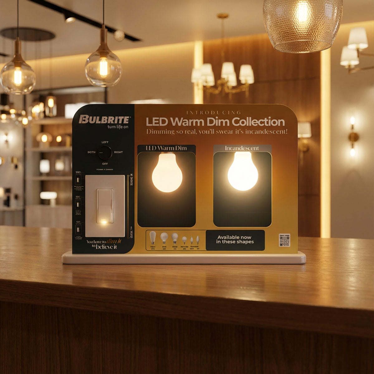 Bulbrite Warm Dim LED bulbs are a direct replacement for incandescent dimming bulbs, getting warmer in color as they dim instead of just lowering output. To make this easy to understand at a glance, we created showroom ready displays that clearly demonstrate how Warm Dim works in real time.