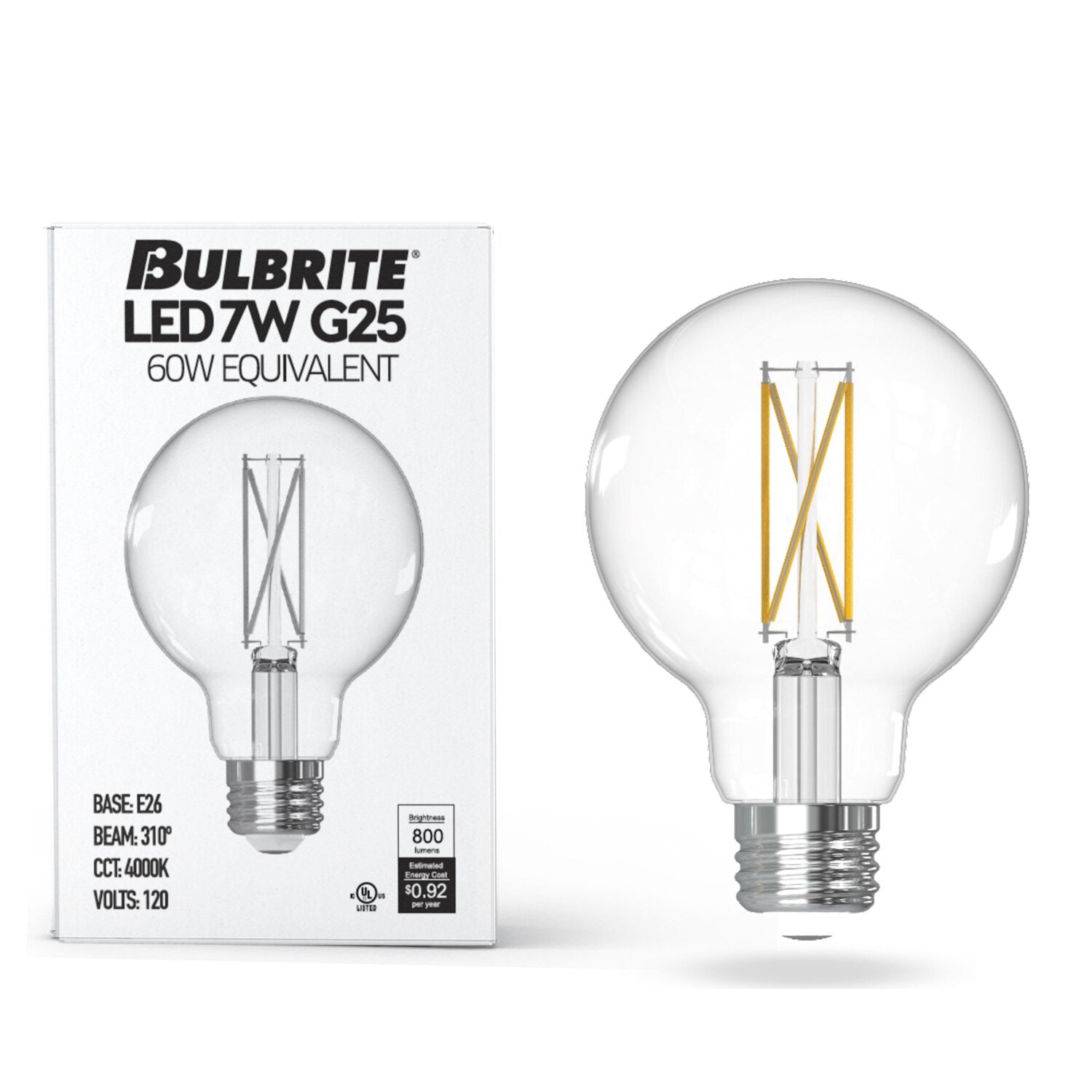- G25 LED bulb with an E26, medium screw, base in a Clear finish.