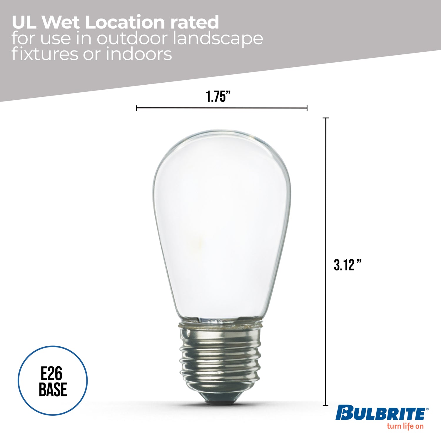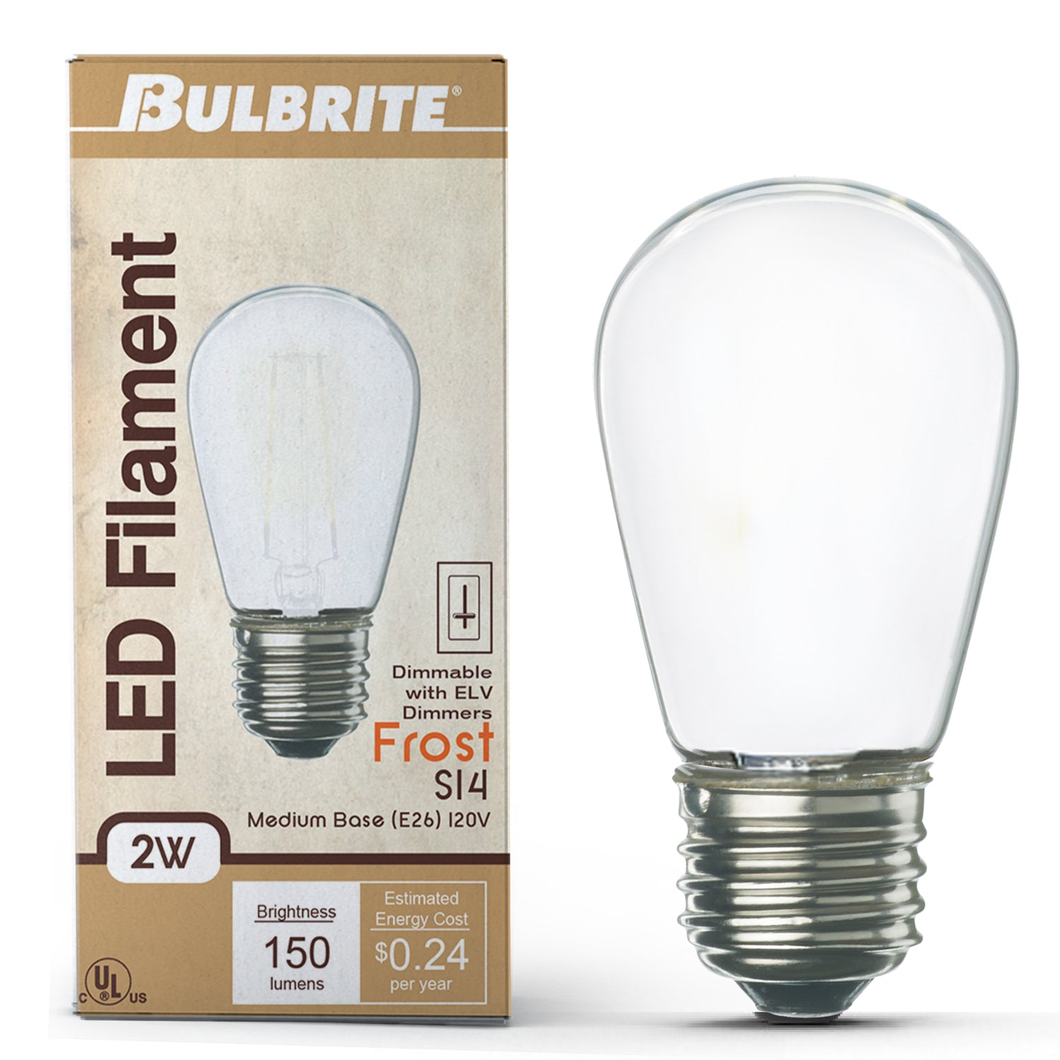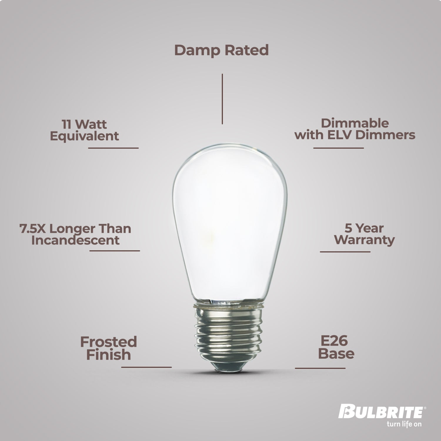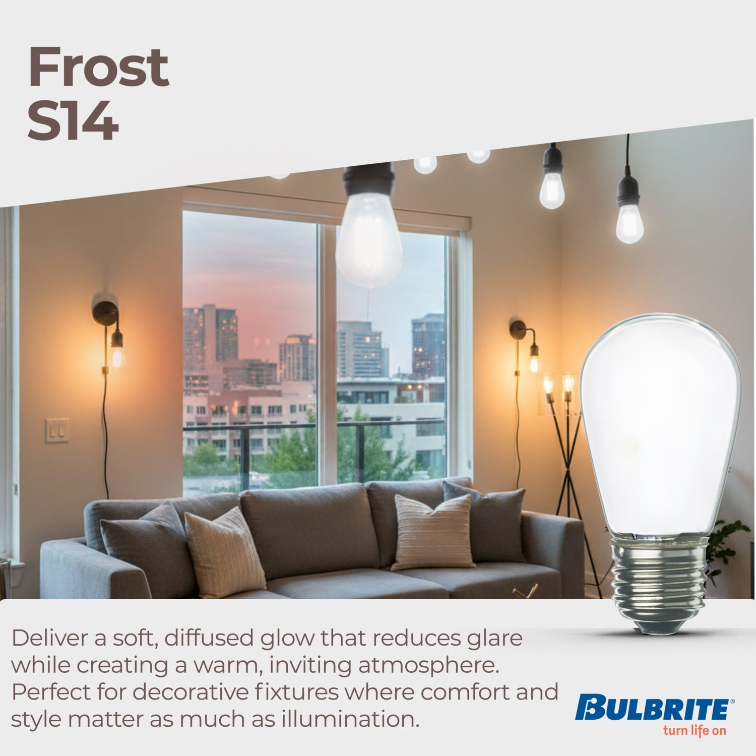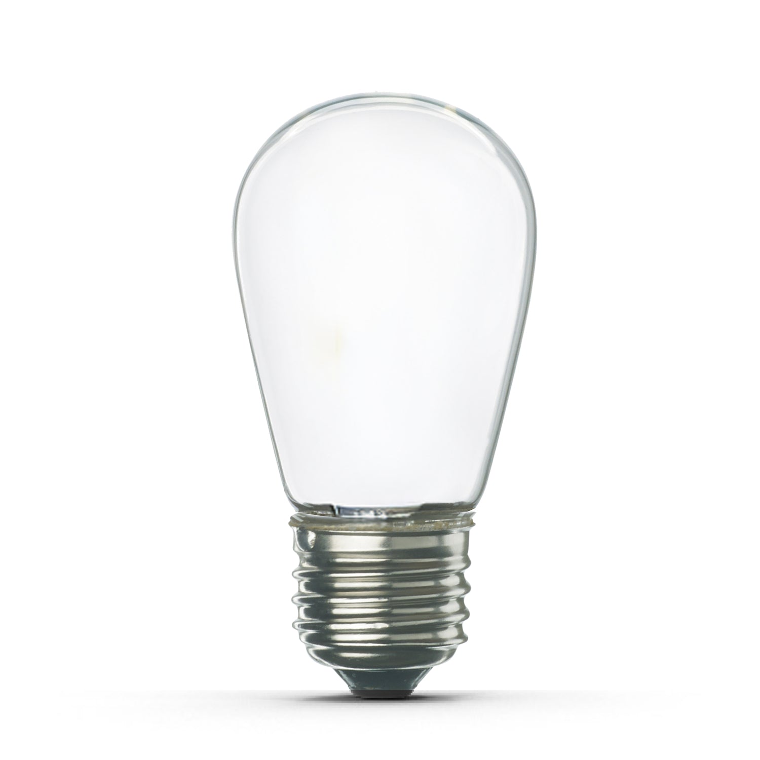 - S14 LED bulb with an E26, medium screw, base in a Frost finish.